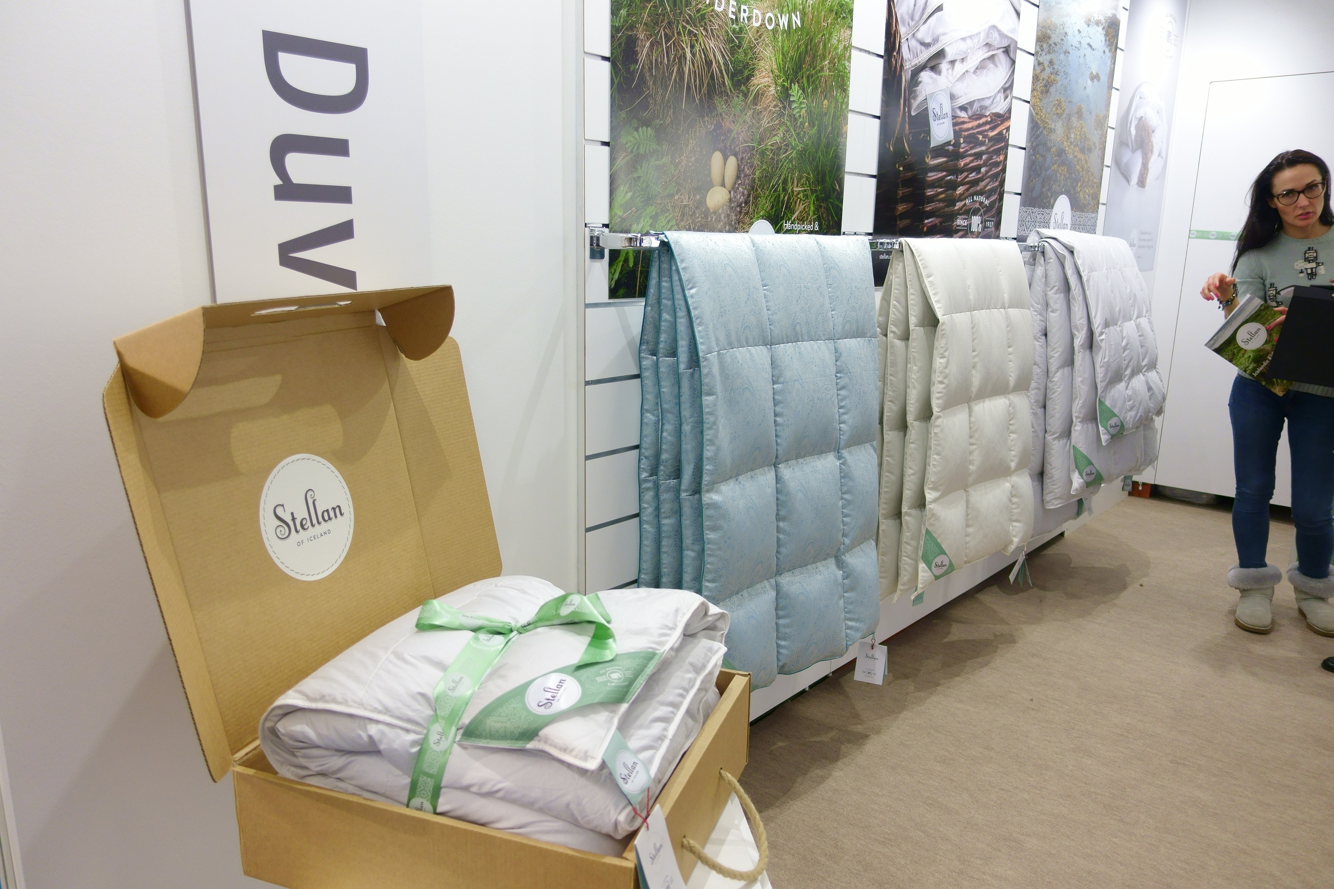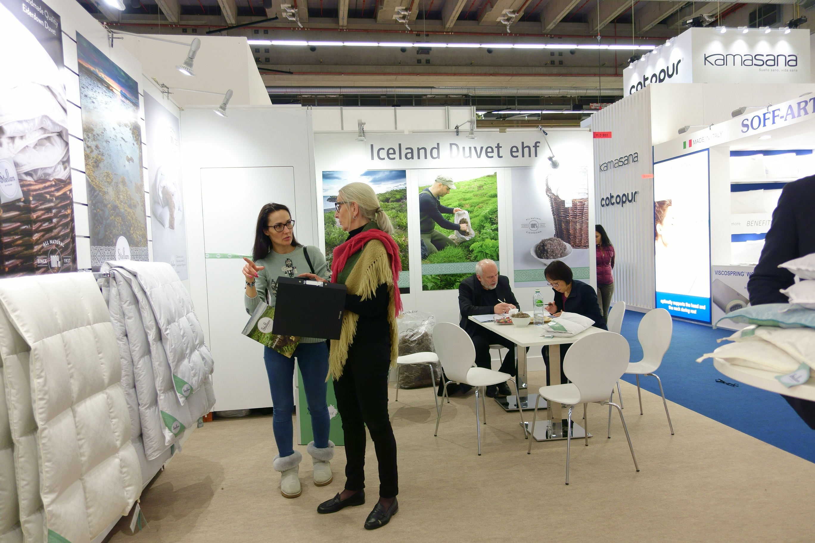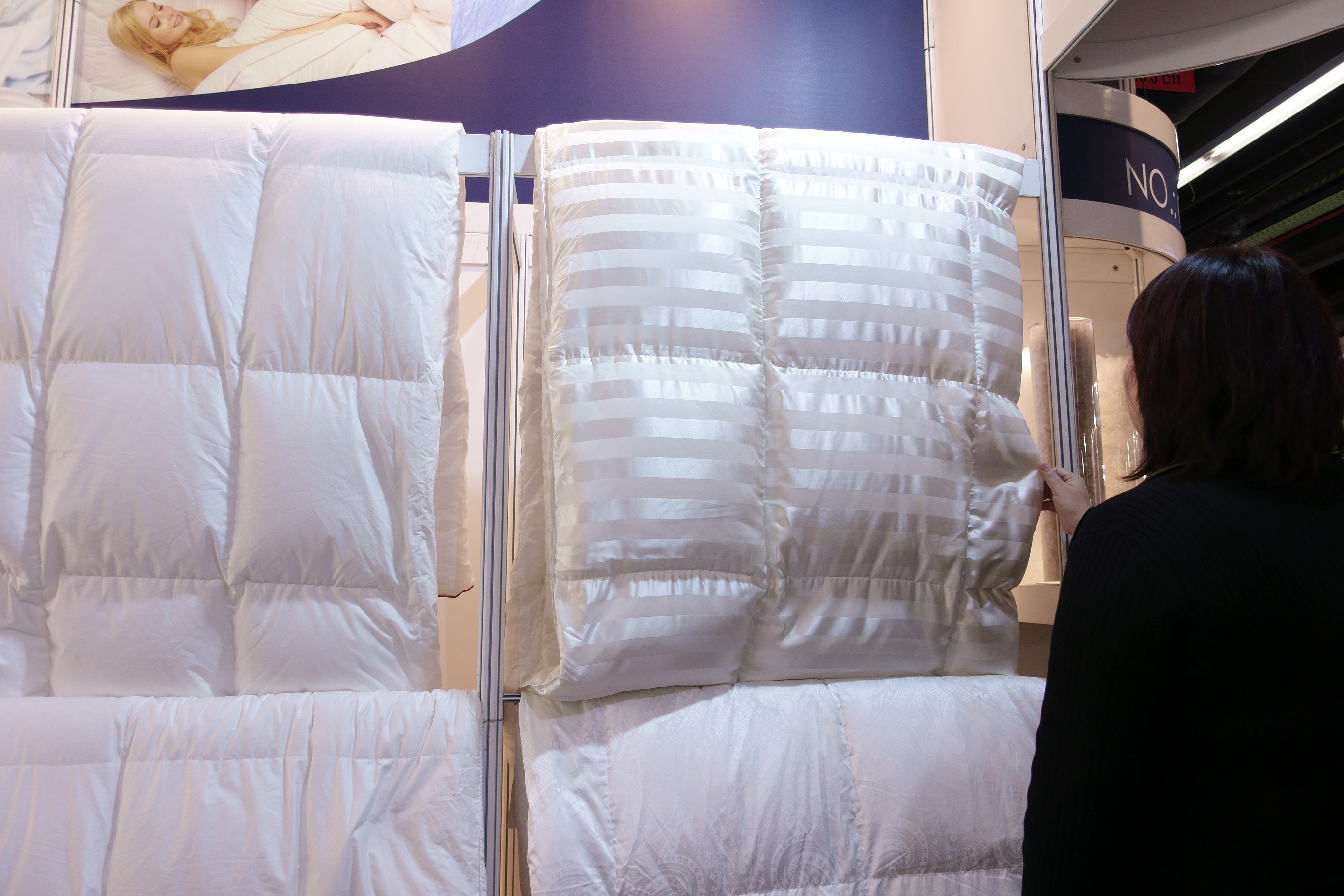 Eftir að hafa káfað á öllum Kínverjunum heimsótti ég höll ellefu.  En þar voru öll flottu evrópsku fyrirtækin sem selja rúma og sængurdót.  Margt svakalega flott.  Sérstaklega æðardúnsængur úr silki sem voru þarna til sýnis á nokkrum básum.  Þarna var meira að segja íslenskt fyrirtæki að sýna æðardúnsængur sem kallast Stellan of Iceland.  Við skulum ekkert ræða verðið en mjög fallegar vörur og allt vottað bak og fyrir af íslenskum stjórnvöldum.  Engin rányrkja hér á ferð.  Mér skilst að æðarbóndin þurfi skriflegt leyfi frá öndinni sem hann týnir dúninn frá í hvert skipti.  Mjög umhverfisvænt og þægilegt fyrir endurnar.  Ólíkt t.d. látunum þegar verið er að plokka kínversku endurnar hálf dauðar.