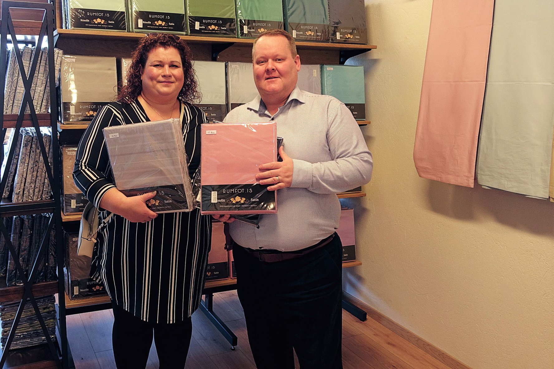 Bergþóra Sigurjónsdóttir ásamt eiginmanni. En Bergþóra vann Facebook leikinn okkar. Í verðlaun fékk hún fjögur sett af rúmfötum að eigin vali.