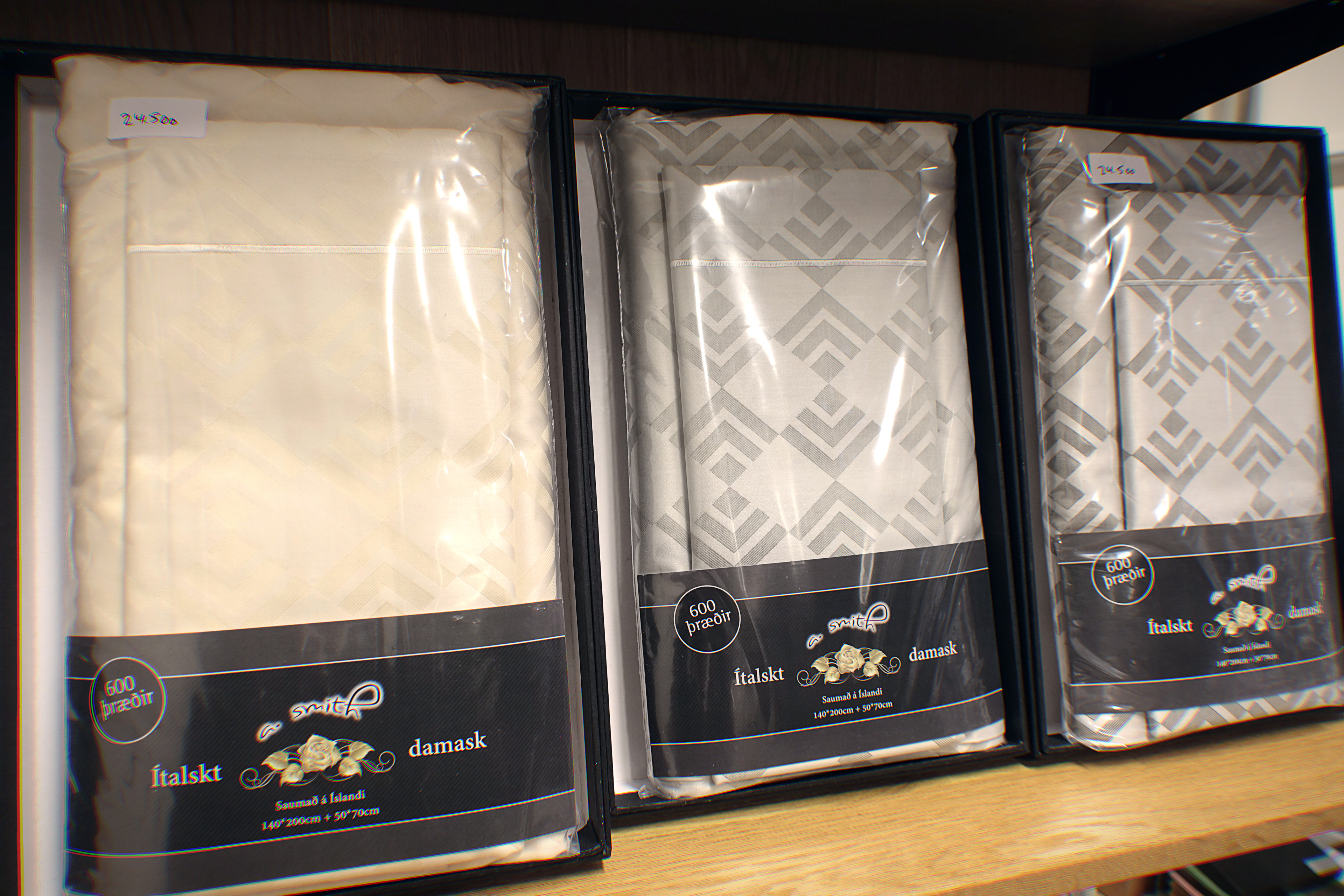 C.a. 20% afsláttur af öllum ítölskum rúmfötum í búðinni.  Rúmföt sem kostuðu 36.700 krónur kosta 29.000 krónur.  19.500 króna 600 þráða satín rúmfötin sem Magga saumaði kosta aðeins 16.000 krónur.