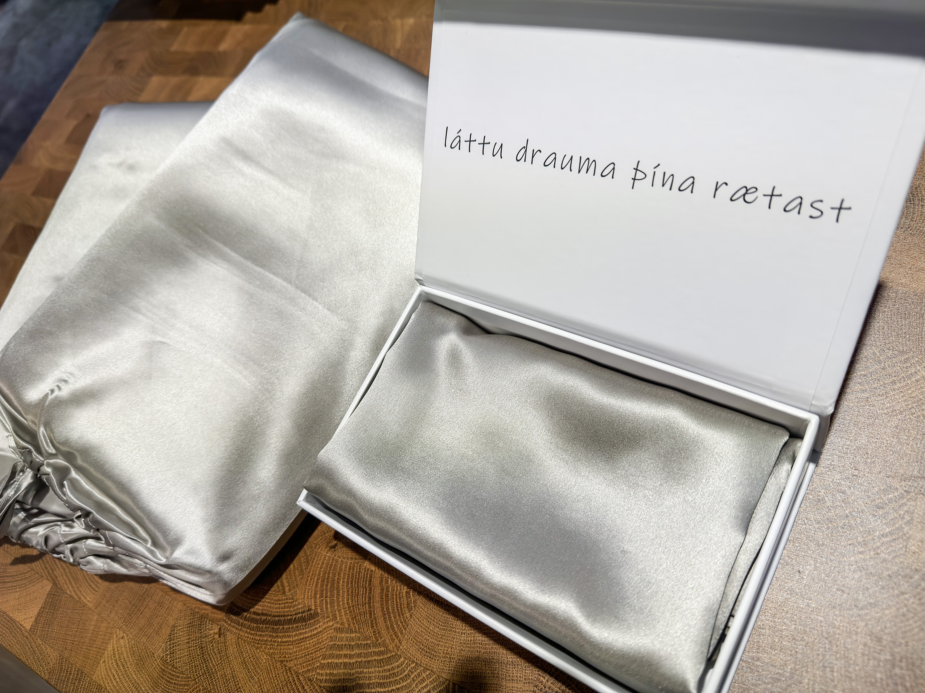 Rúmfatasett kostar 38.800 krónur úr 22mm Mulberry silki.