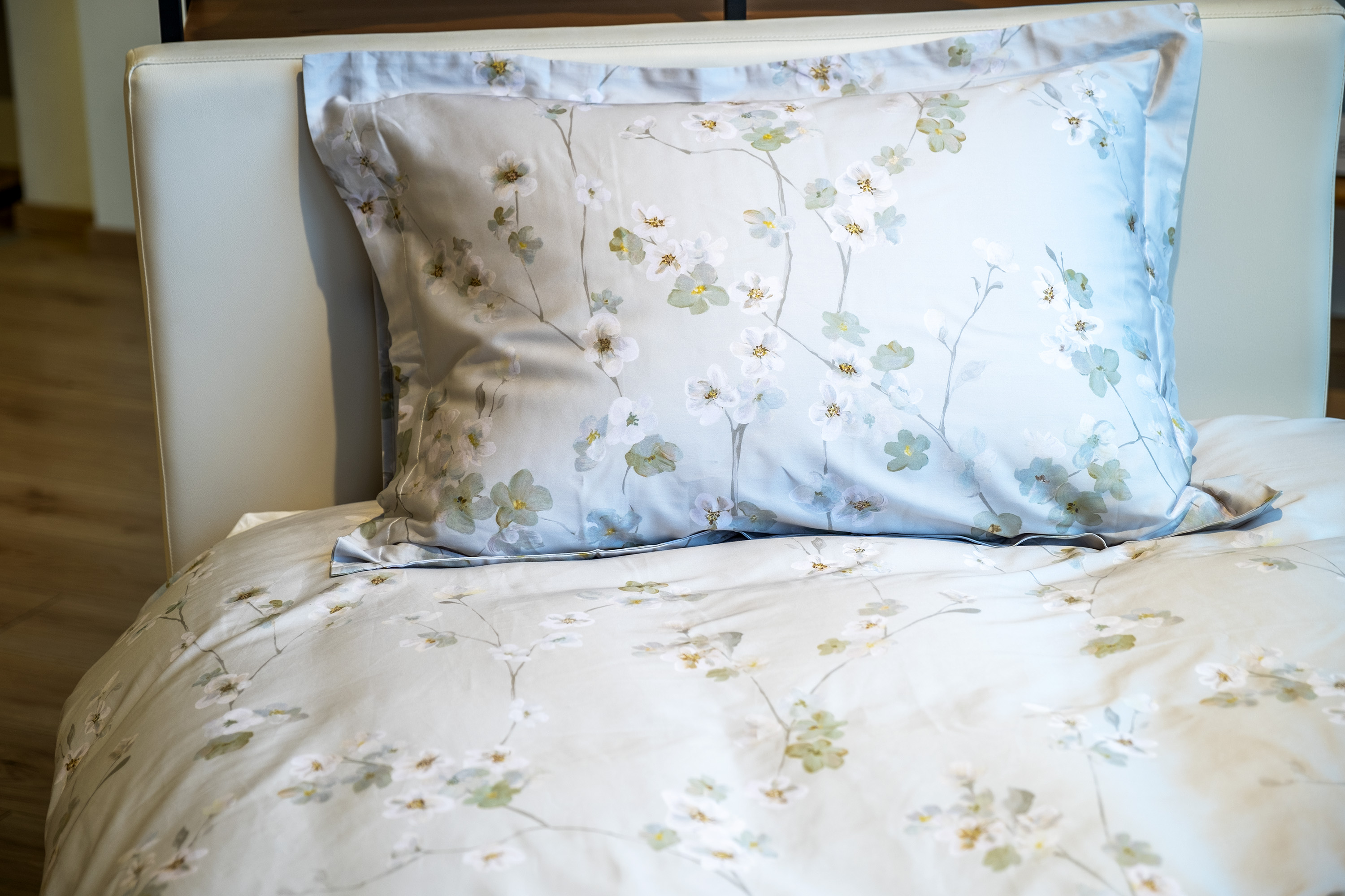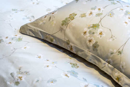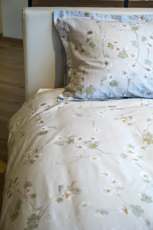 Fallega fölgræn rúmföt með hvítum blómum. Munstrið er handmálað og síðan prentað á rúmfötin.