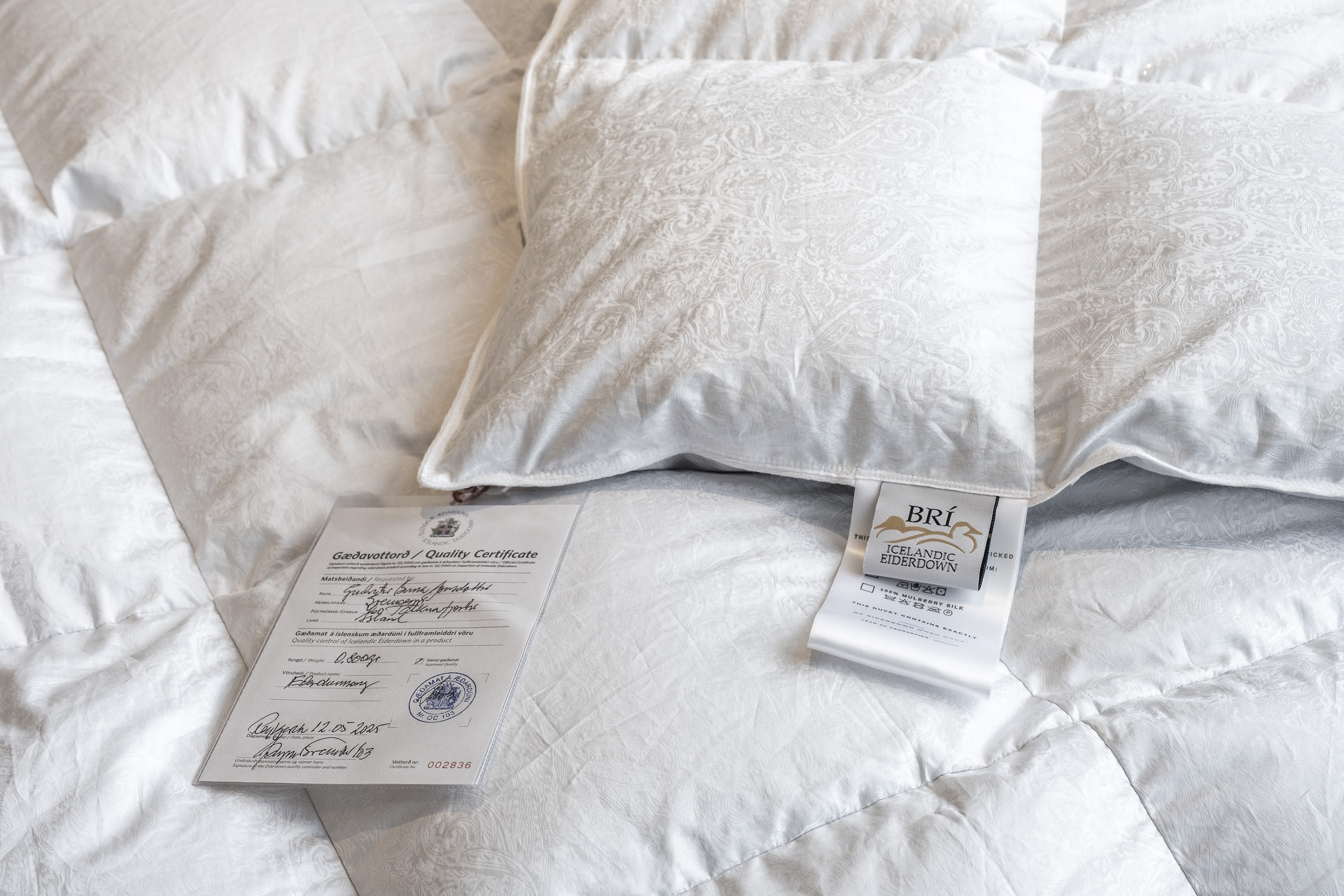 800g æðardúnsæng frá Hannesi og Birnu á Sveinseyri.  Ytra byrðið er úr 460 þráða damaski. Þau hjónin hafa um árabil selt fyrsta flokks æðardún beint til heildsala en hafa ákveðið að hefja framleiðslu á æðardúnsængum og selja þær í samvinnu við Rúmföt.is beint til viðskiptavina.