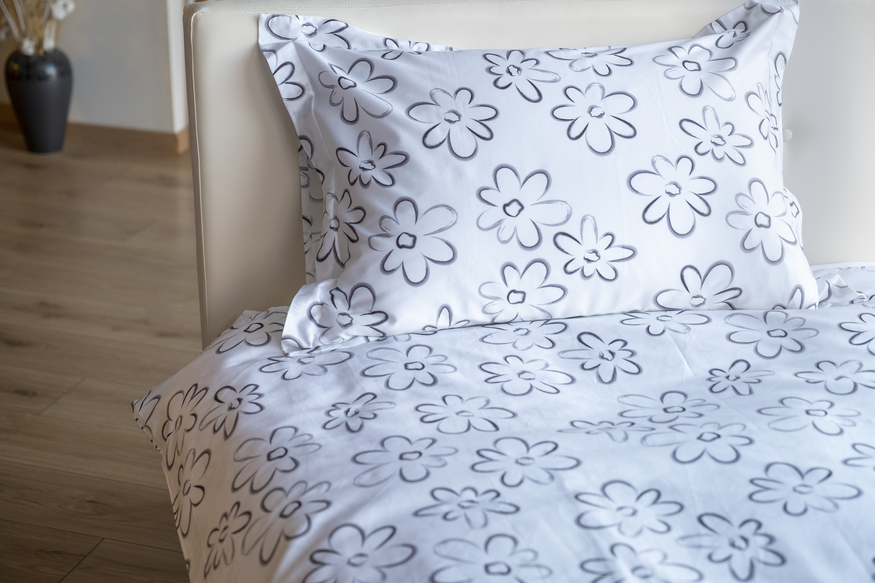 Koddaverið er lokað með vasa og með 4cm kanti á öllum hliðum. Sængurverinu er lokað með tölum.